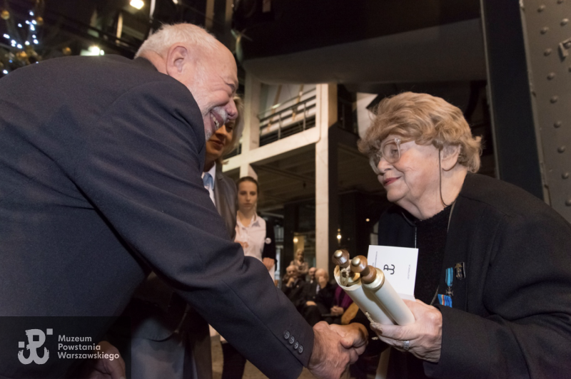 Prezes Związku Powstańców Warszawskich ppłk Zbigniew Galperyn „Antek” wręcza mjr Marii Stypułkowskiej-Chojeckiej „Kamie” Medal Pamiątkowy z okazji 70. Rocznicy Powstania Warszawskiego podczas Wigilia Powstańców w MPW, 16 grudnia 2014, fot. Zbigniew Furman, Zbiory MPW