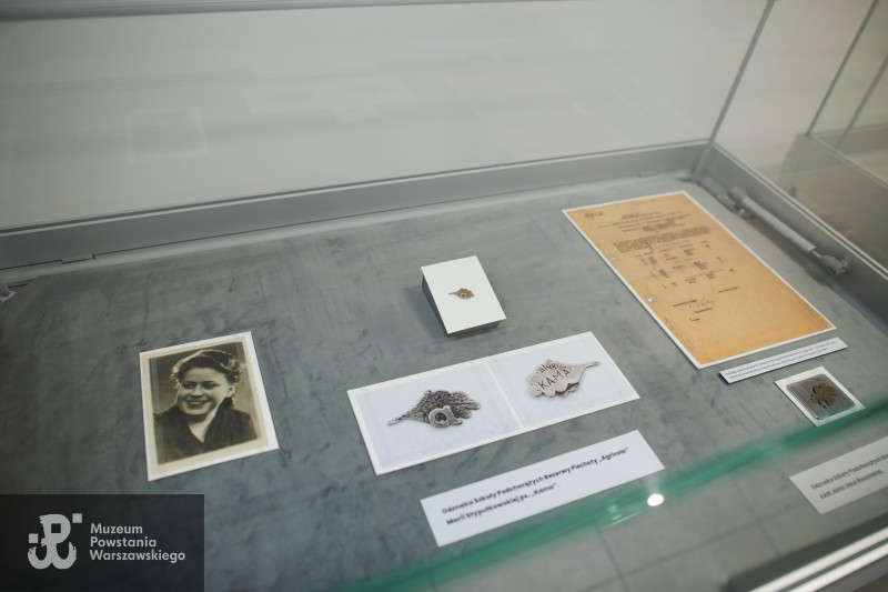Pamiątki „Kamy”: odznaka „Agrikoli”, jej powiększone zdjęcie i kopia protokołu szkoły potwierdzającego jej ukończenie, 31 stycznia 2025, fot. Katarzyna Stefanowska, Zbiory MPW