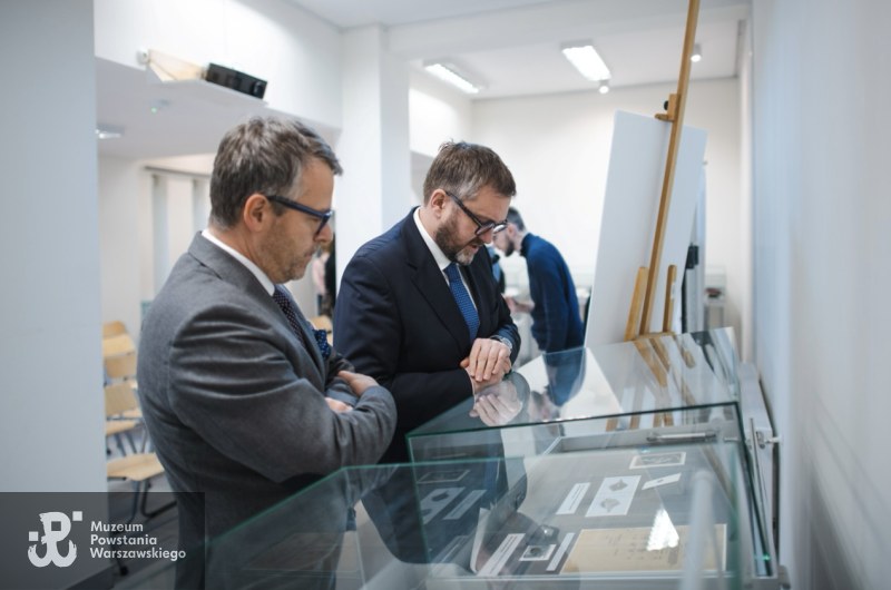 Od lewej dyrektor Archiwum Akt Nowych, Mariusz Olczak i dyrektor Muzeum Powstania Warszawskiego, Jan Ołdakowski oglądają pamiątki „Kamy”, 31 stycznia 2025, fot. Katarzyna Stefanowska, Zbiory MPW