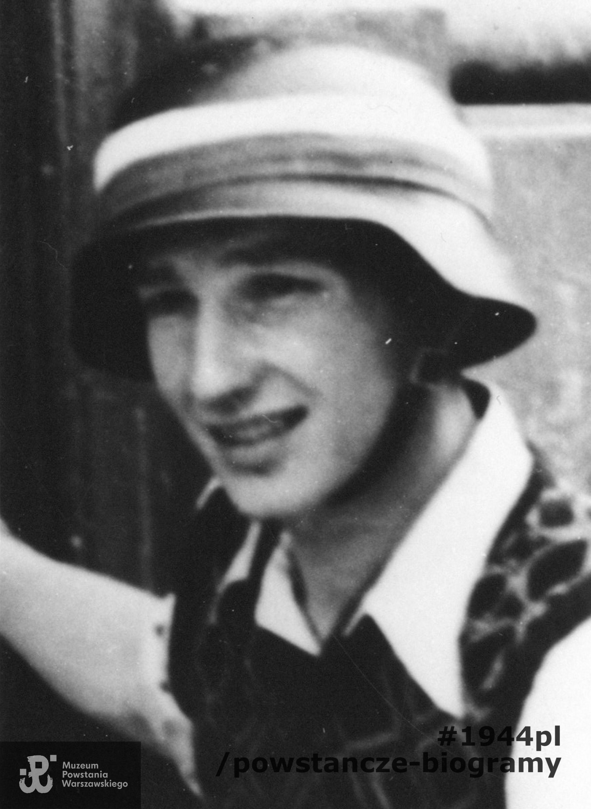 Fotografia z Powstania Warszawskiego. Śródmieście Północne. Bożena Grabowska "Magda" i kpr. pchor. Antoni Tuleja "Niedźwiedź" na podwórzu gmachu dawnego Towarzystwa Ubezpieczeń "Rosja" przy ul. Marszałkowskiej 124/128, róg Moniuszki 11. Autorem zdjęcia jest Eugeniusz Lokajski "Brok". Ze zbiorów Muzeum Powstania Warszawskiego, sygn.MPW-IN/345