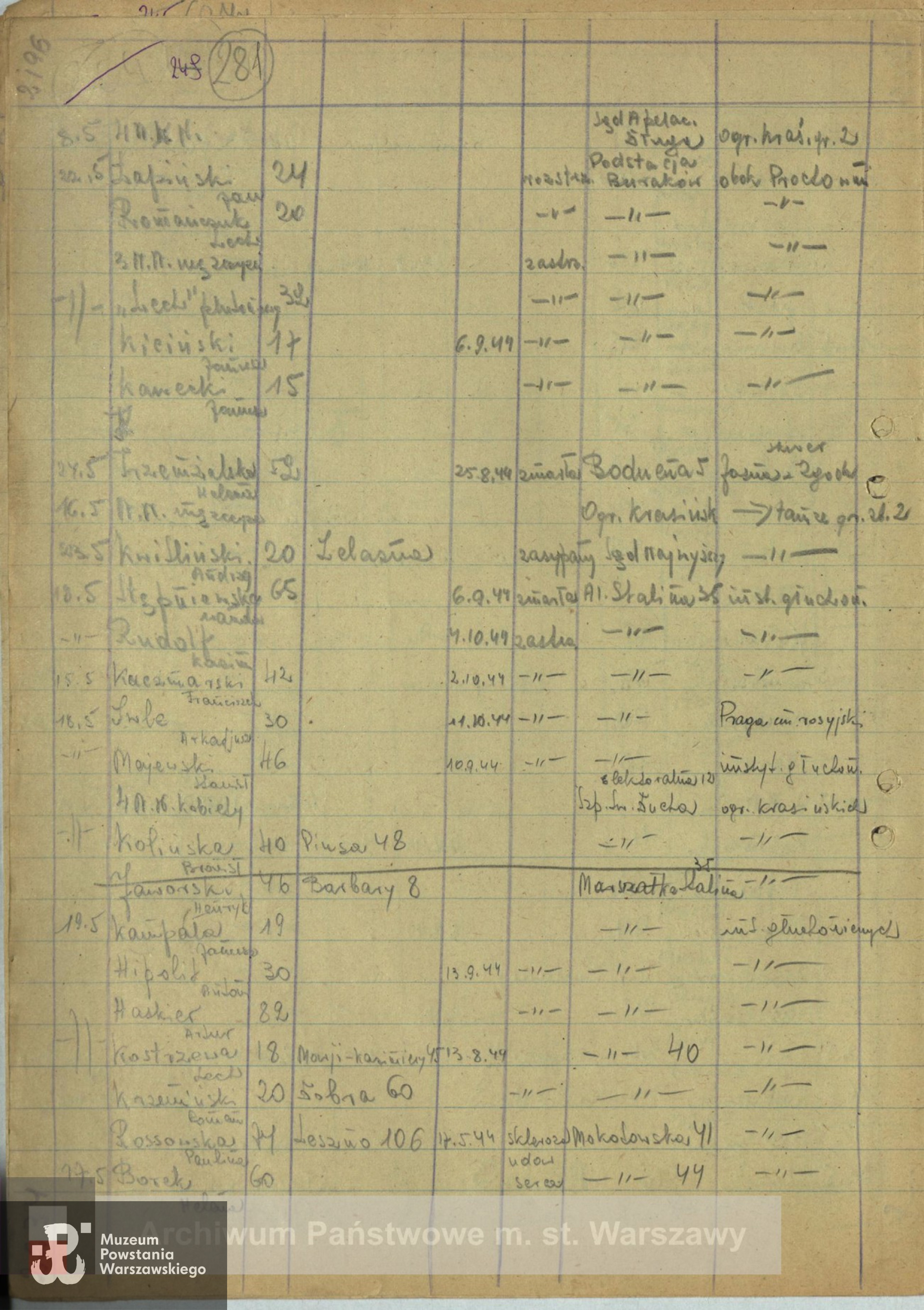 Spotykana także data śmierci 26.08.1944. Miejsce ekshumacji opisane w protokołach PCK jako plac działkowy między podstacją MZK "Buraków" a dawną prochownią.