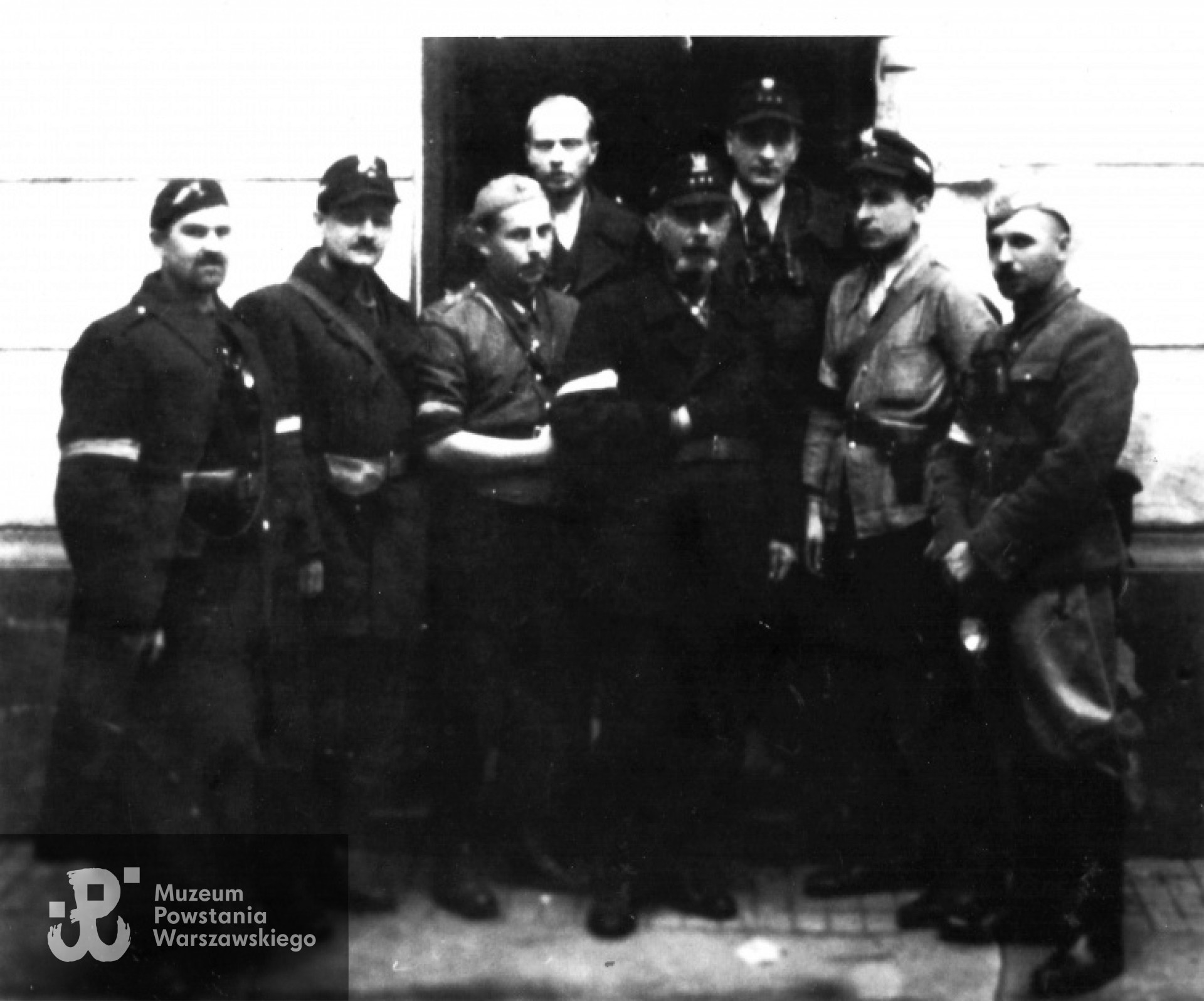 Fotografia z Powstania Warszawskiego przedstawiająca oficerów 3. kompanii por. „Lewara” (Jana Piotrowskiego). Stoją od lewej: por. „Lerski” (Edmund Jan Miller, w płaszczu), por. Jan Petrykowski ps. Zabawa, por. ”Baszta„ (NN, z ręką na pasie), kpt. Romuald Stępowski ps. Zawierucha (w drzwiach, bez czapki), kpt. Stanisław Skrzyniarz ps. Dębicz (w środku, z bródką), kpt. Bolesław Kobyliński ps. Reżanowicz (w drzwiach, po prawej), por. Tadeusz Brodniewicz ps. Lech (drugi od prawej) i ppor. Tadeusz Edwin Stasiakowski "Czarny”, „Zawisza” (w furażerce). Fot. ze zbiorów Muzeum Powstania Warszawskiego, sygn. MPW-IK/2819. Ujęcie tożsame: MPW-IK/1478. Opis na podstawie książki Jana Piotrowskiego „Lewara” pt. Jak zdobyć kościół św. Krzyża i Komendę Policji?”, MediaArt, Warszawa 1994. Zdjęcie udostępnił p. Wojciech Stasiakowski
