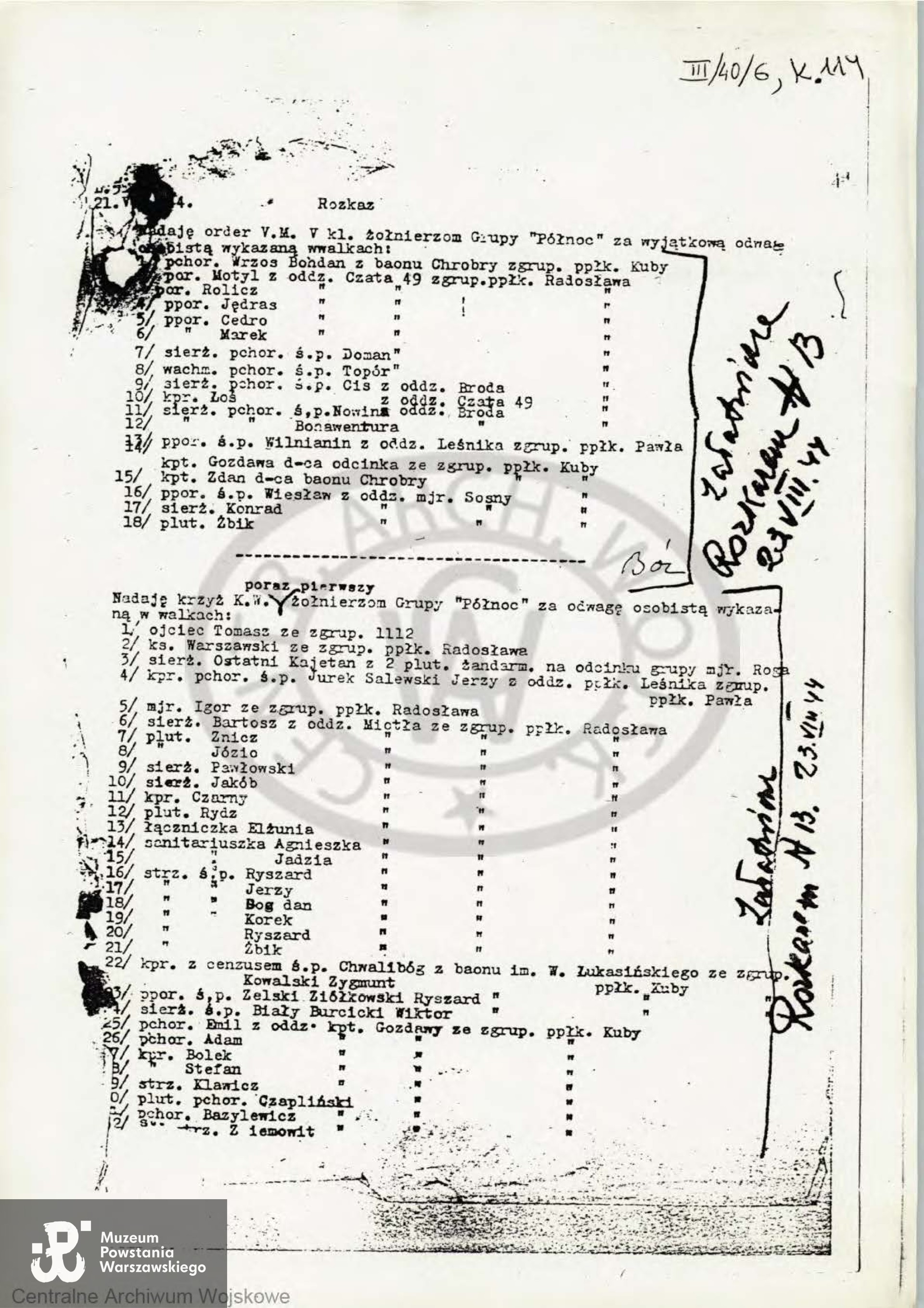 Krzyż Walecznych - wymieniona w rozkazie Dowódcy AK z dn. 21.08.1944 L. 515/I wśród nadań Krzyża Walecznych po raz pierwszy następującym żołnierzom Grupy „Północ” za odwagę osobistą wykazaną w walkach - poz. 213 łącznika „Anna” z oddz. „Broda 53” ze zgrupowania ppłk. „Radosława”.