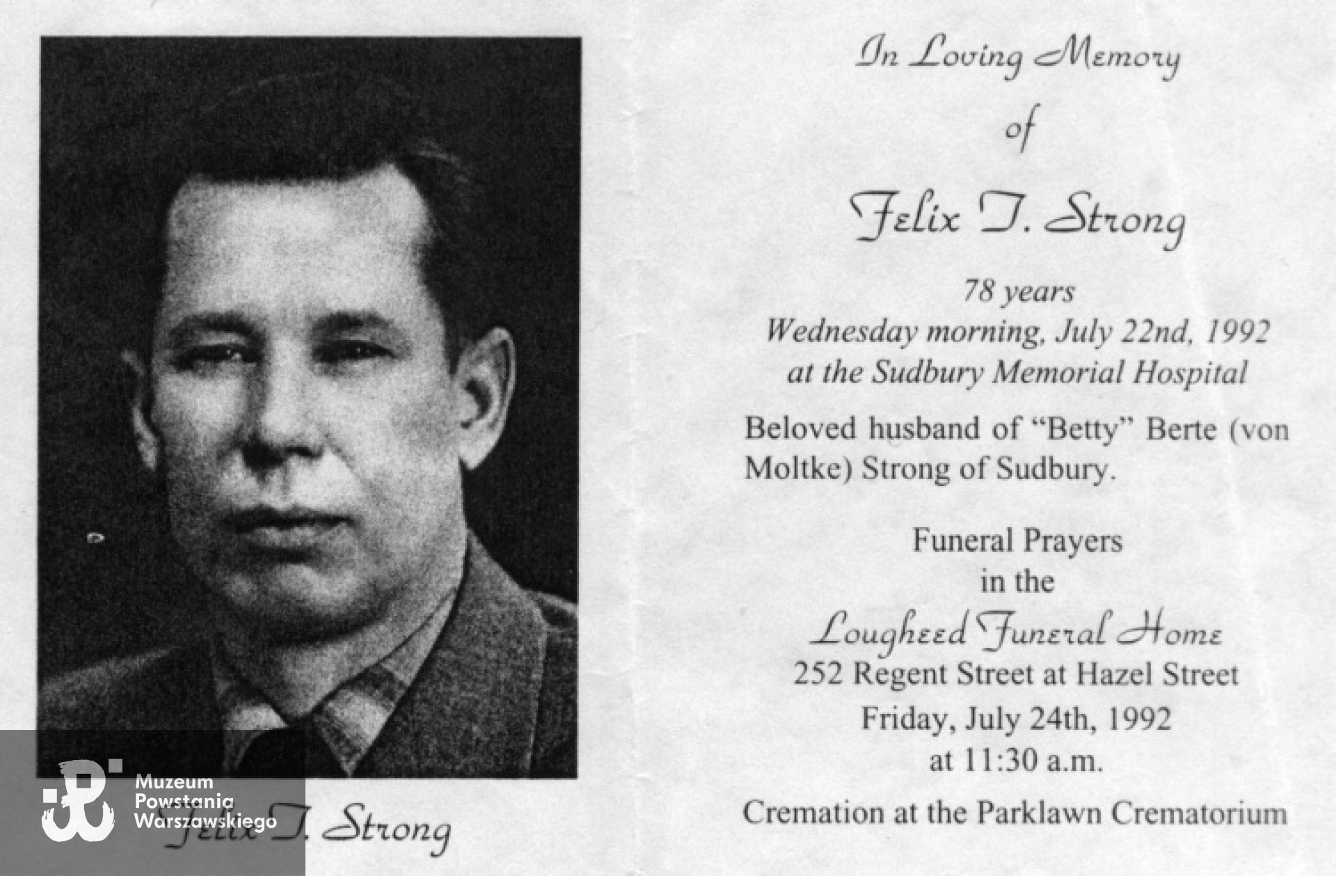 Wyjechał do Sudbury w Kanadzie i zmienił nazwisko na Felix J. Strong