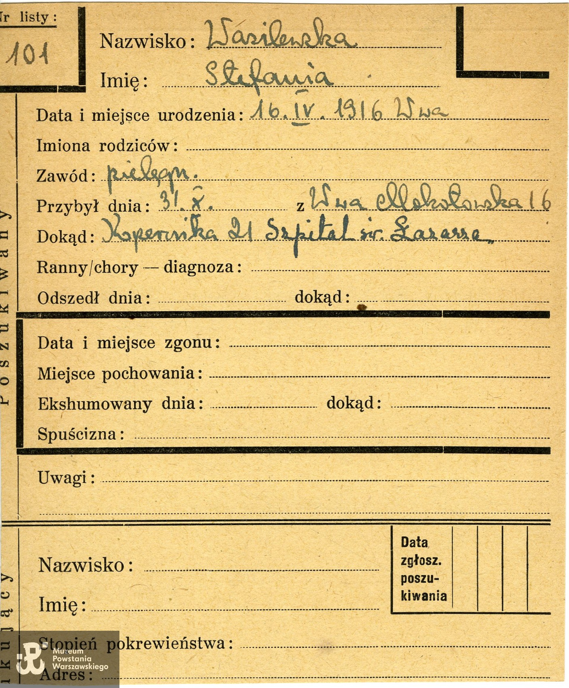 Posiadasz jakiekolwiek dane lub materiały o mieszkańcach stolicy, którzy zginęli lub zaginęli w trakcie Powstania Warszawskiego? Chcesz poprawić biogram lub dodać nowe informacje o ofiarach cywilnych? Zaproponuj zmiany w formularzu. Wszystkie uwagi będą weryfikowanie przez grono historyków Muzeum Powstania Warszawskiego i po weryfikacji uzupełniane w bazie. Kontakt w sprawie Powstańczych Biogramów: wtorki (od 12:00 do 16:00) i piątki (od 12:00 do 16:00) osobiście w Pokoju Kombatanta po wcześniejszym umówieniu na spotkanie lub telefonicznie w ww. dniach i godzinach pod numerem: 22 539 79 36, mailowo: powstanczebiogramy@1944.pl lub mpalgan@1944.pl