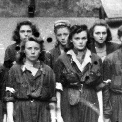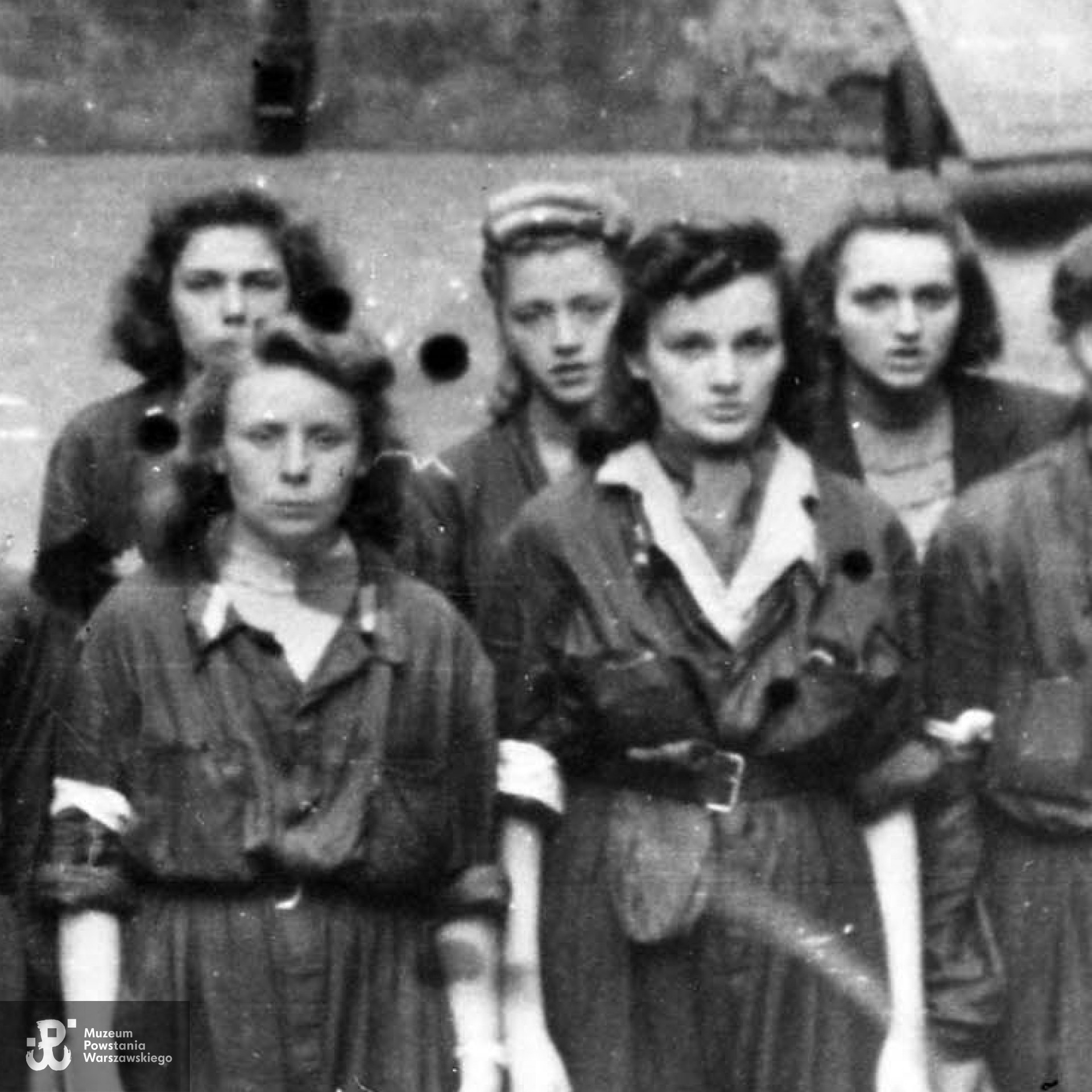 Fotografia z Powstania Warszawskiego. Śródmieście Południowe. Sanitariuszki i łączniczki z 1. plutonu „Kłosa” 3. kompanii „Redy” batalionu „Miłosz” podczas mszy św. odprawianej na podwórzu kamienicy przy ul. Mokotowskiej. W pierwszym rzędzie stoją od lewej: w hełmie Ryszard Lewandowski „Oporek”, za nim nieco zasłonięty łącznik Ziuk (w jasnej kurtce), łącznik NN, obok niego Wacława Sutowska ps. Aćka, Hanna Baranowska „Lalka”, Krystyna Kleszczewska „Krysia”, patrolowa „Teresa” (prawdopodobnie Zofia Tomasik), Janina Kleszczewska „Kopernik„, NN, NN. W drugim rzędzie stoją: za „Aćką” - „Dzidka” (prawdopodobnie Helena Schabińska), obok niej Daniela Białowąs „Niutka” (za H. Baranowską „ Lalką"), następnie "Jadwiga", NN i "Alusia" (prawdopodobnie Alicja Gilewska). Pozostałe osoby nierozpoznane. Autorem zdjęcia jest Wojciech Marczyński ”Bogusław„. Fot. ze zbiorów Muzeum Powstania Warszawskiego, sygn. MPW-IH/5916