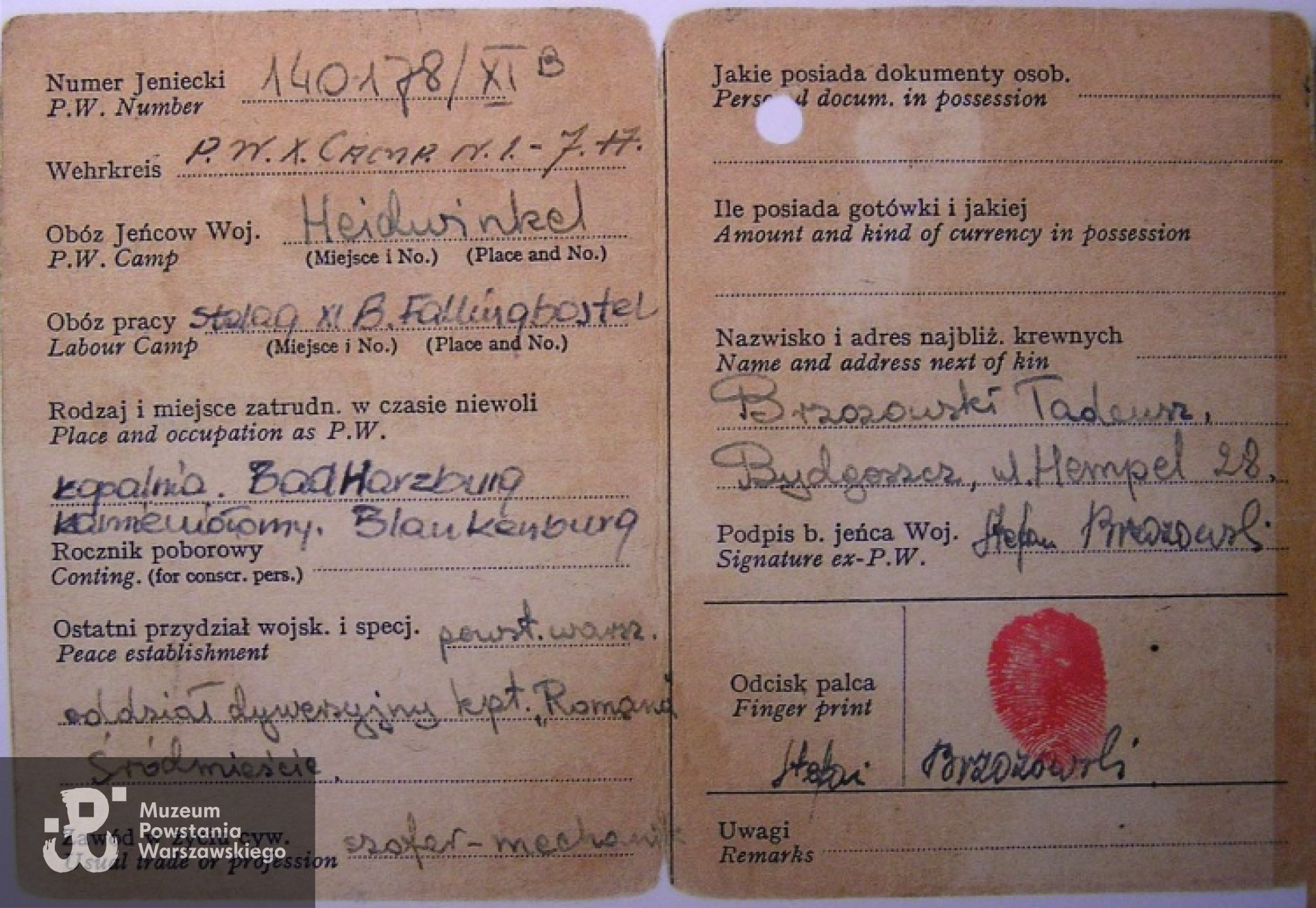 Niewola niemiecka - jeniec Stalagu XI B Fallingbostel; pracował niewolniczo w kamieniołomie Bad Harzburg - Blankenburg.