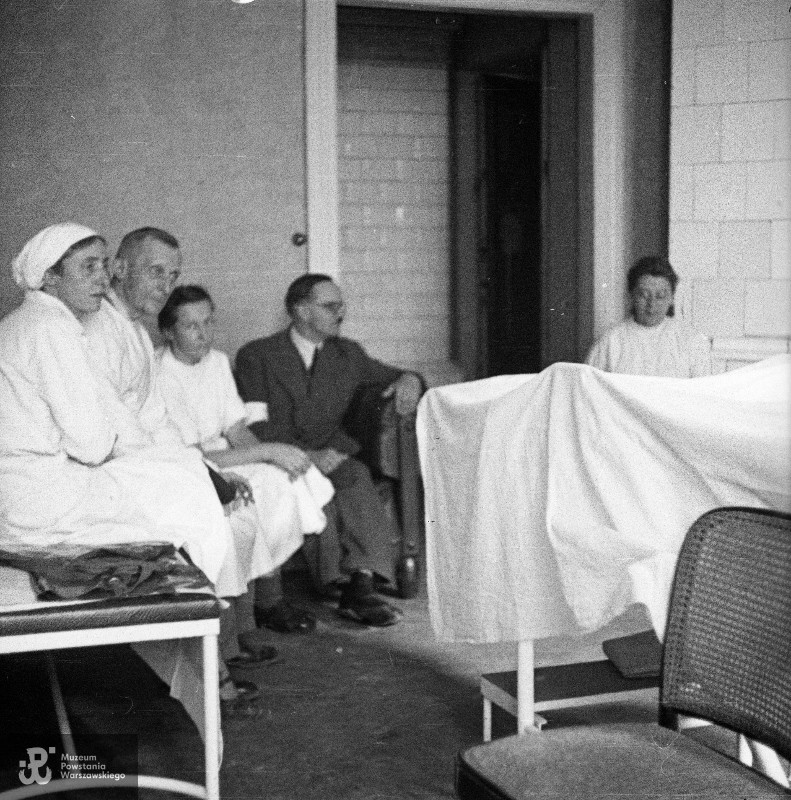 Fotografia z Powstania Warszawskiego. Personel medyczny w szpitalu polowym przy ulicy Mokotowskiej. Po lewej stronie dwóch mężczyzn, zapewne lekarzy (jeden w białym kitlu). Po jego obu stronach , na kozetce lekarskiej, siedzą doie pielęgniarki w białych fartuchach. Kolejna pielęgniarka siedzi na tle kaflowego pieca.