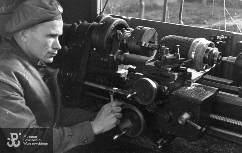 Fotografia z okresu II wojny światowej. Włochy. Mechanik przy maszynie tokarskiej w warsztatach łączności 2 Korpusu Polskiego.