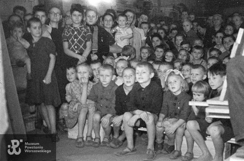 Fotografia z Powstania Warszawskiego. Powiśle. Widownia teatrzyku "Kukiełki pod Barykadą". Przeważają siedzące dzieci; po lewej stronie kobiety, najprawdopodobniej matki.