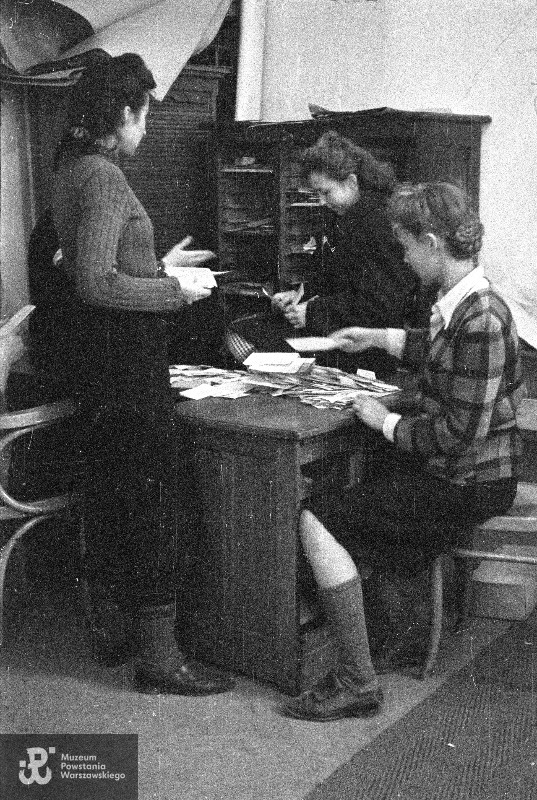 Fotografia z Powstania Warszawskiego. Urzędniczki poczty powstańczej sortujące listy wyjęte ze skrzynek, pracujące w sortowni na terenie Głównej Poczty Polowej przy ul. Świętokrzyskiej 28. Pierwsza od prawej kobieta w kraciastym żakiecie siedzi na krześle przy biurku, na którym leży stos korespondencji. Dwie pozostałe urzędniczki stoją. Pośrodku Danuta Cichocka "Anielka".